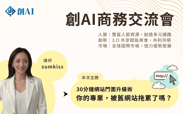 講師:sumkiss 第一印象決定了商務成交的 80%。sumkiss 老師將針對「舊網站如何拖累專業感」進行拆解,教你如何在短短 30 分鐘內,透過精準的視覺調整與資訊架構,讓網站成為 24 小時幫你自動成交的數位業務員。