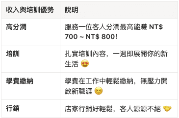 完訓後可直接店內上班,工作時段超彈性(早起、夜貓都適合)。
