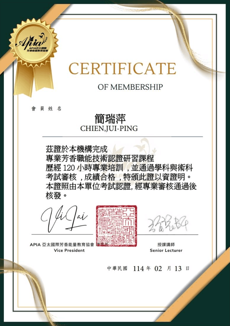 專業認證: 持有亞太國際芳香能量教育協會認證講師資格,具備英式按摩專業認證,確保教學品質與專業水準。
