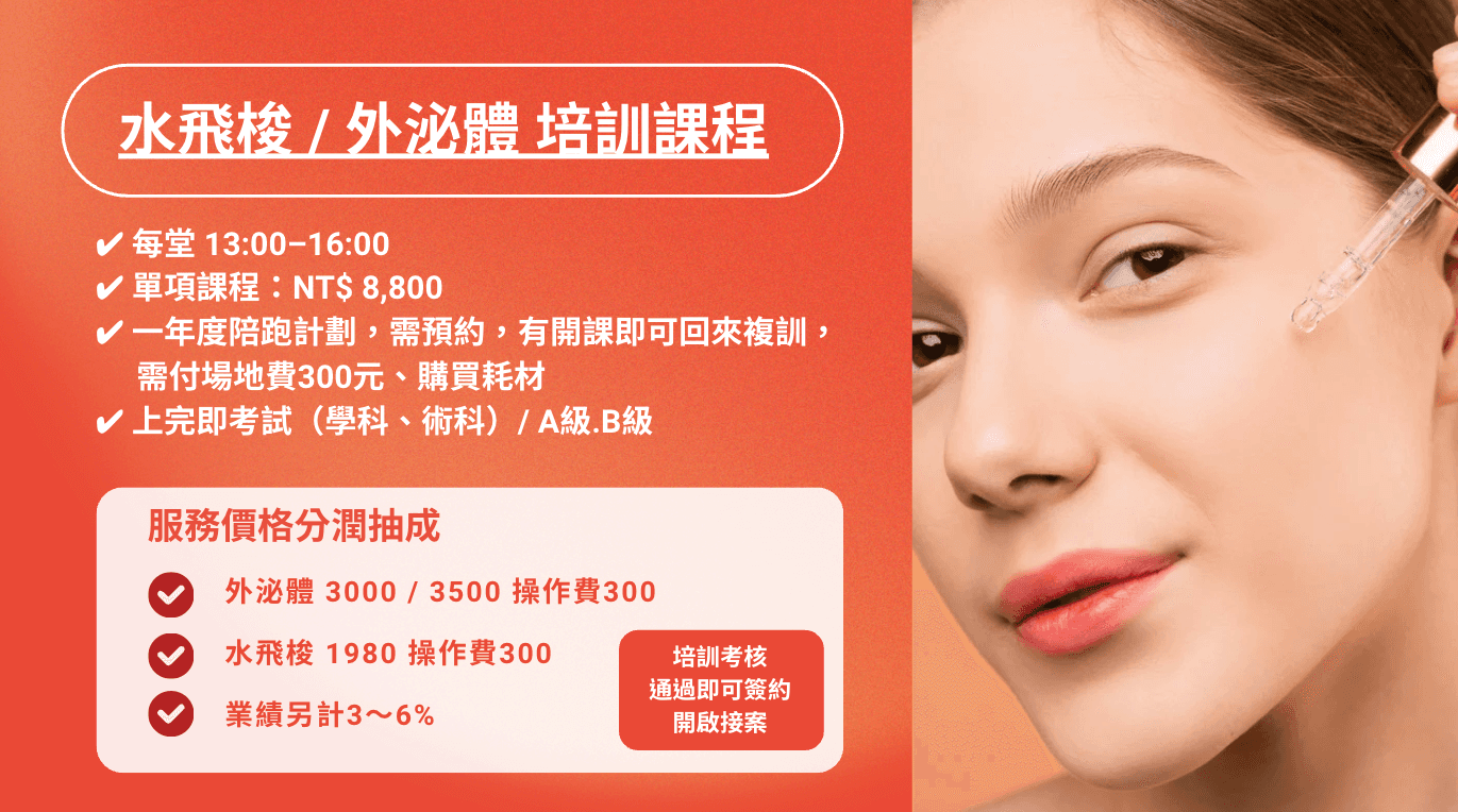 睫絲美業教育 的水飛梭與外泌體課程,讓你從理論、實操、銷售三個面向全面升級。