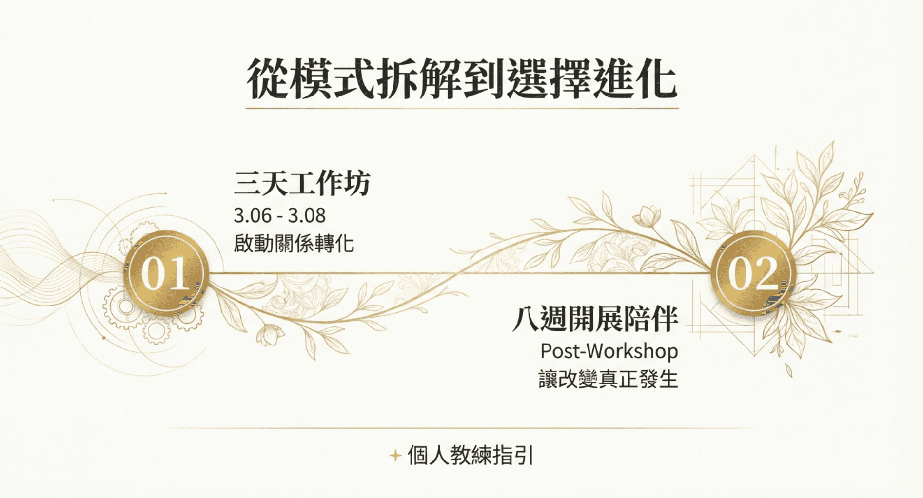 獨創「3 + 8」深度整合模式:三天工作坊 + 八週開展陪伴 我們深知改變需要時間沈澱,因此我們不只提供觀念,更提供落地的實踐陪伴。