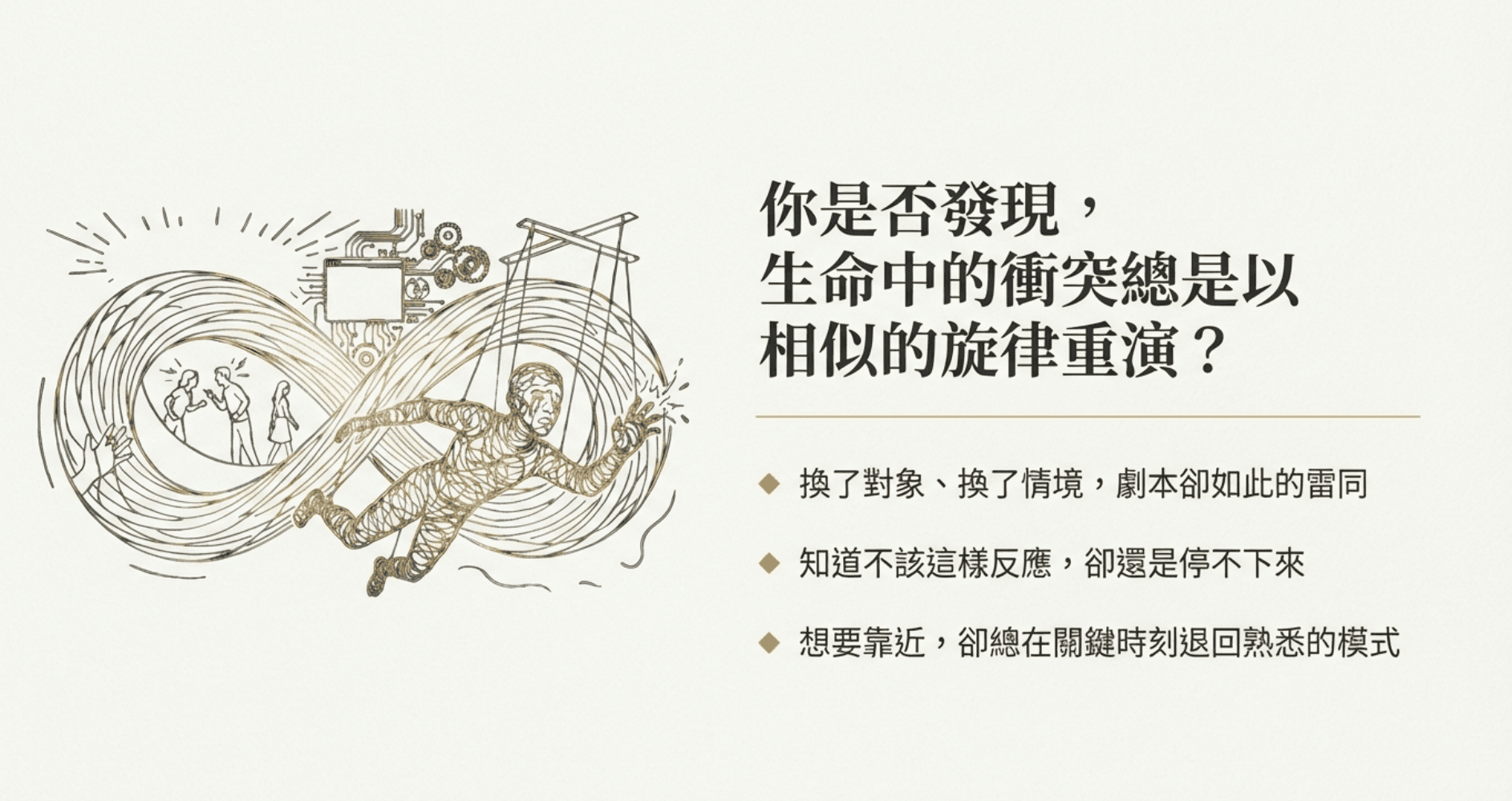 你是否發現,生命中的衝突總是以相似的旋律重演?這是一場關於關係、意識與內在系統的深度旅程,帶領你從「小我」視角,走向宏觀的「系統」視角。