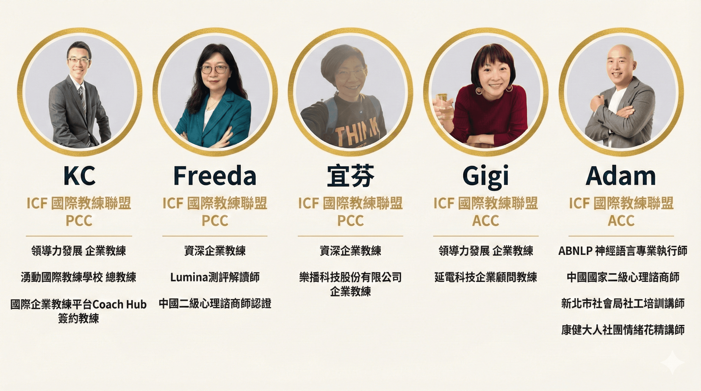 資深教練團: Adam, Freeda, Gigi, KC, Ray, 宜芬, 乃榮