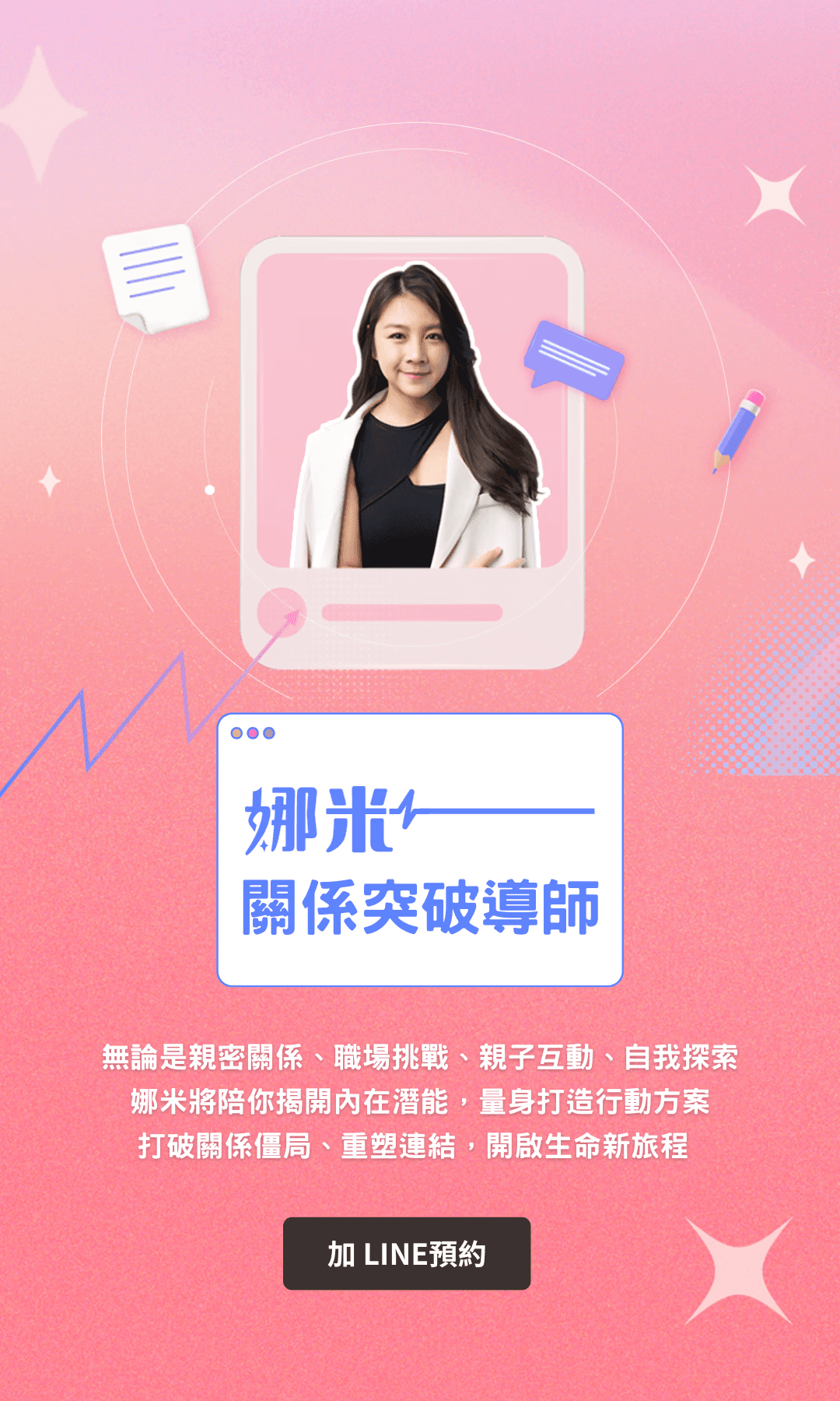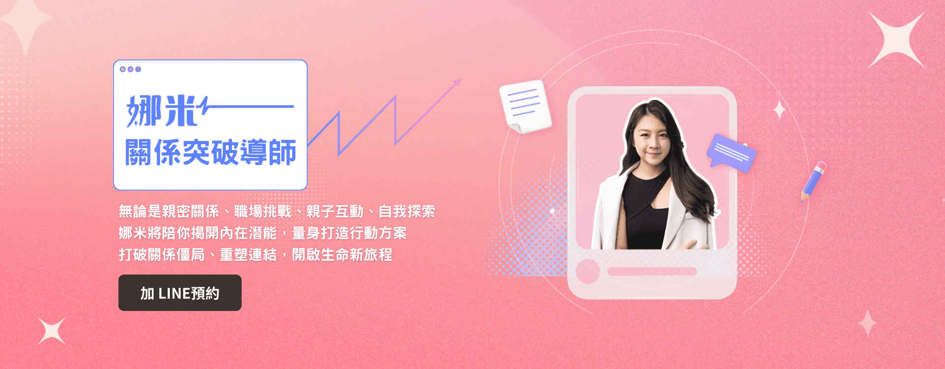 我是娜米,你的關係突破導師。我知道維持一段穩定的關係很不容易,我會透過一對一的深度諮詢,根據你和對方的個人特質,以及互動模式,為你們量身打造專屬的突破策略,協助你從內在成長,開啟充滿連結與支持的長期關係之路。